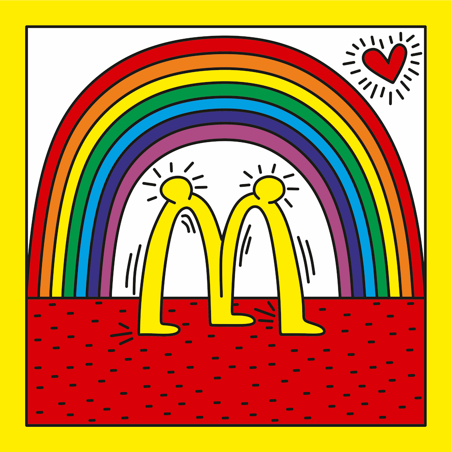 Through designer Sebas G. grupooma’s Haring-inspired logo, the world-famous Golden Arches become a pair of linked lovers, embracing beneath the echoing arch of a rainbow. The red and yellow brand colors become a bold frame, surrounding the central image in ecstatic tones. For Sebas G. grupooma, the accessibility of Haring’s art is its most inspiring feature. “What inspires me the most about his art is that it was dedicated and created for the general public—it was not intended for commercial graphic purposes,” said Sebas G. grupooma.